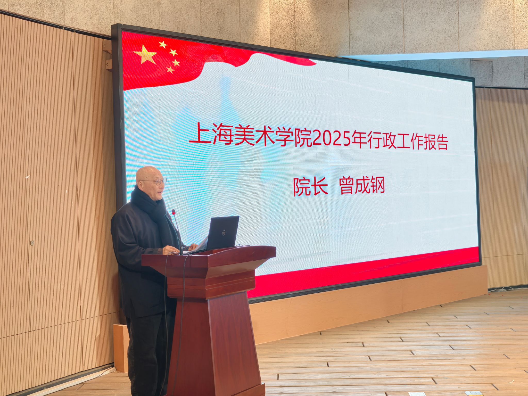 首先,曾成钢院长作2025年行政工作报告,报告指出,2025年作为“十四五”收官之年,学院在人才培养、队伍建设、科研创作、国际合作及社会服务等方面成效显著:教材课程建设实现国家级奖项突破,毕业生去向落实率达90.68%;科研经费进校约2300万,多项展览获国际关注;深化多国院校合作,拓展文化服务边界。