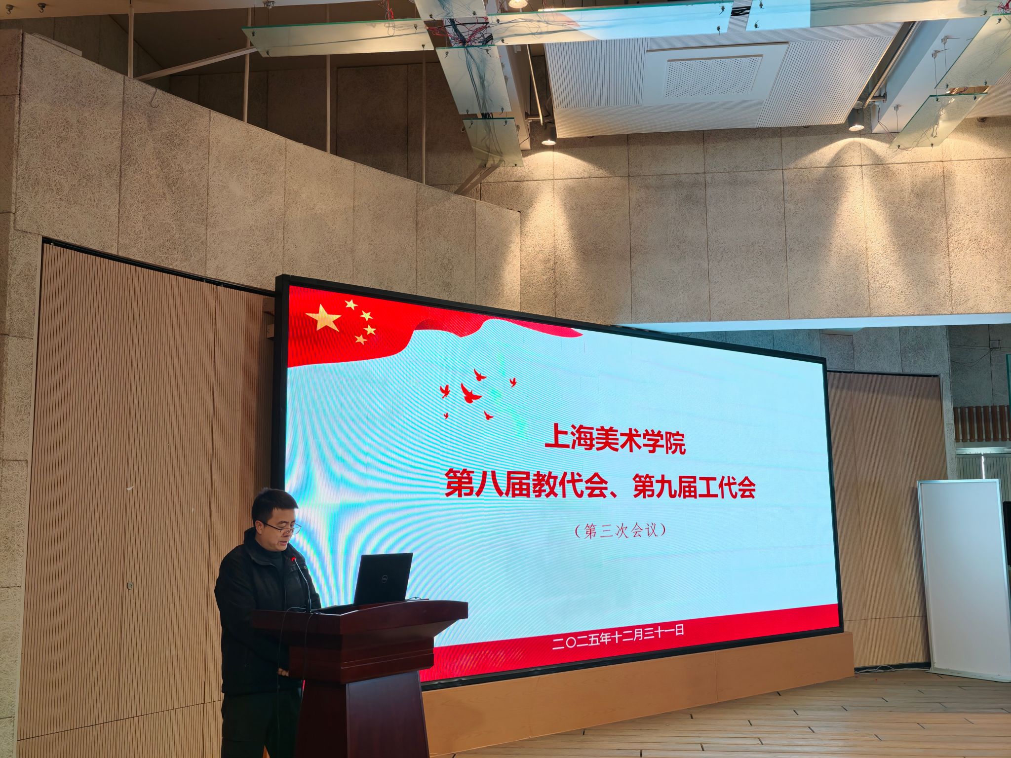 2025年12月31日,上海美术学院第八届教代会、第九届工代会第三次会议在美院418室召开。党委书记陈静、院长曾成钢、执行院长金江波等院领导及教师代表出席,纪委书记宋国栓主持会议。