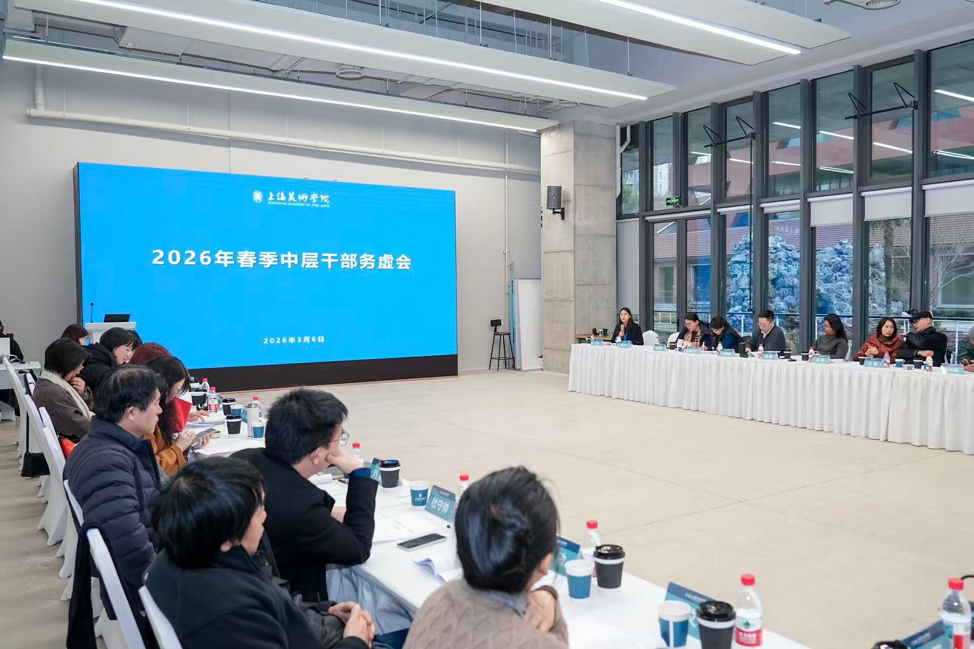 3月6日下午,上海美术学院召开2026年春季中层干部务虚会。学院领导班子成员、各系、部、中心及工青妇负责人参加会议。会议旨在深入学习贯彻落实党的二十届四中全会精神,将党中央的决策部署与学院实际紧密结合,结合学校综合改革方案,聚焦“十五五”规划编制与学院高质量发展,激发全院中层干部“追卓越、创一流”的内生动力与担当精神,切实发挥中层干部在学院治理体系和治理能力现代化建设中的骨干与关键作用。党委副书记、纪委书记宋国栓主持会议。
