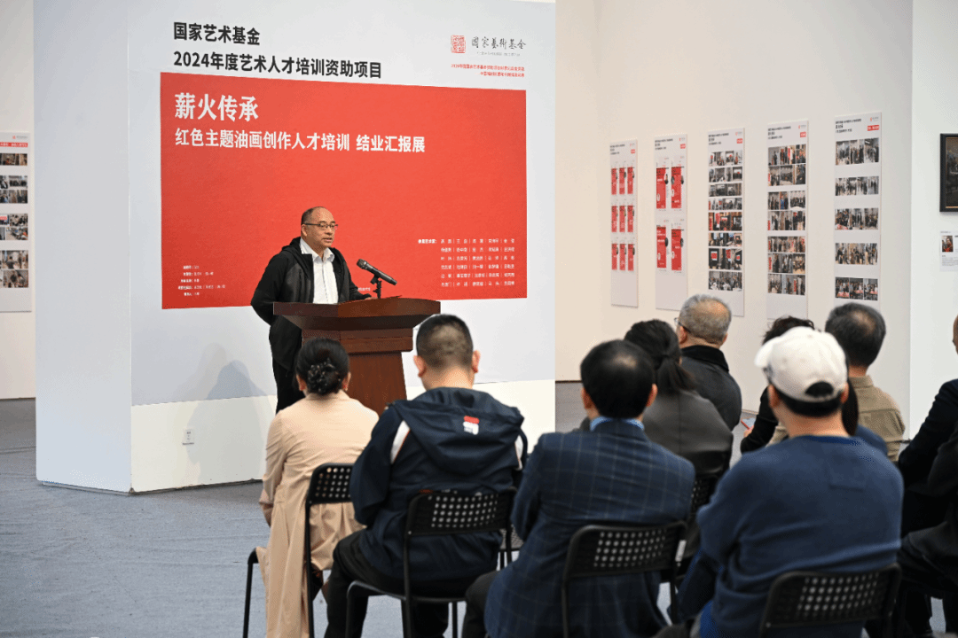 项目负责人、上海美术学院油画系副主任李根汇报项目整体情况,并向各主办、承办、指导单位致谢。项目历时近两年、集中培训 180 余天,汇聚全国顶尖专家团队,30 位青年艺术家完成 40 余幅大型主题创作与 100 余幅草图、写生作品。他介绍,项目后续将出版作品文献集,持续传播红色文化。