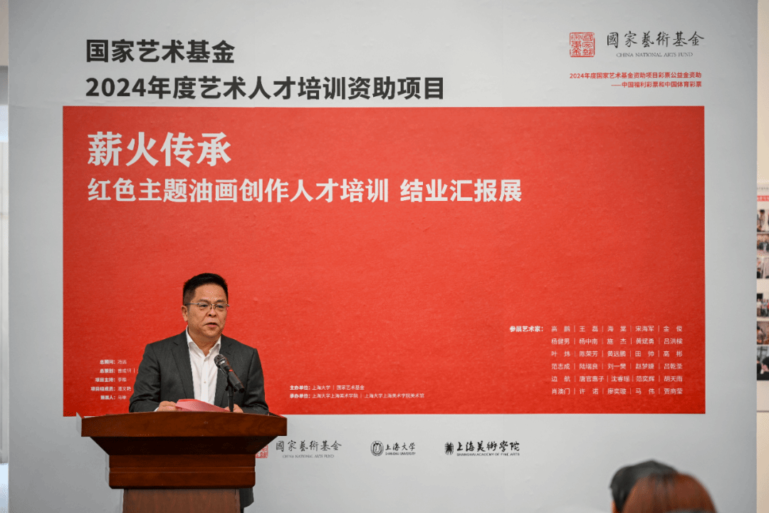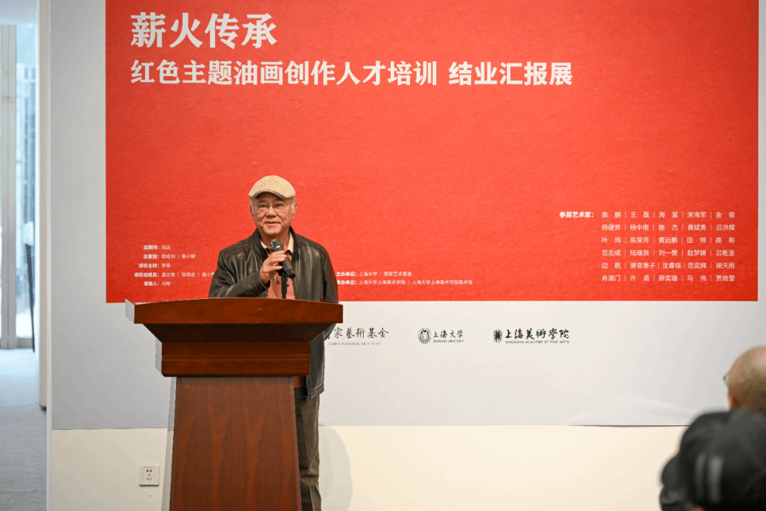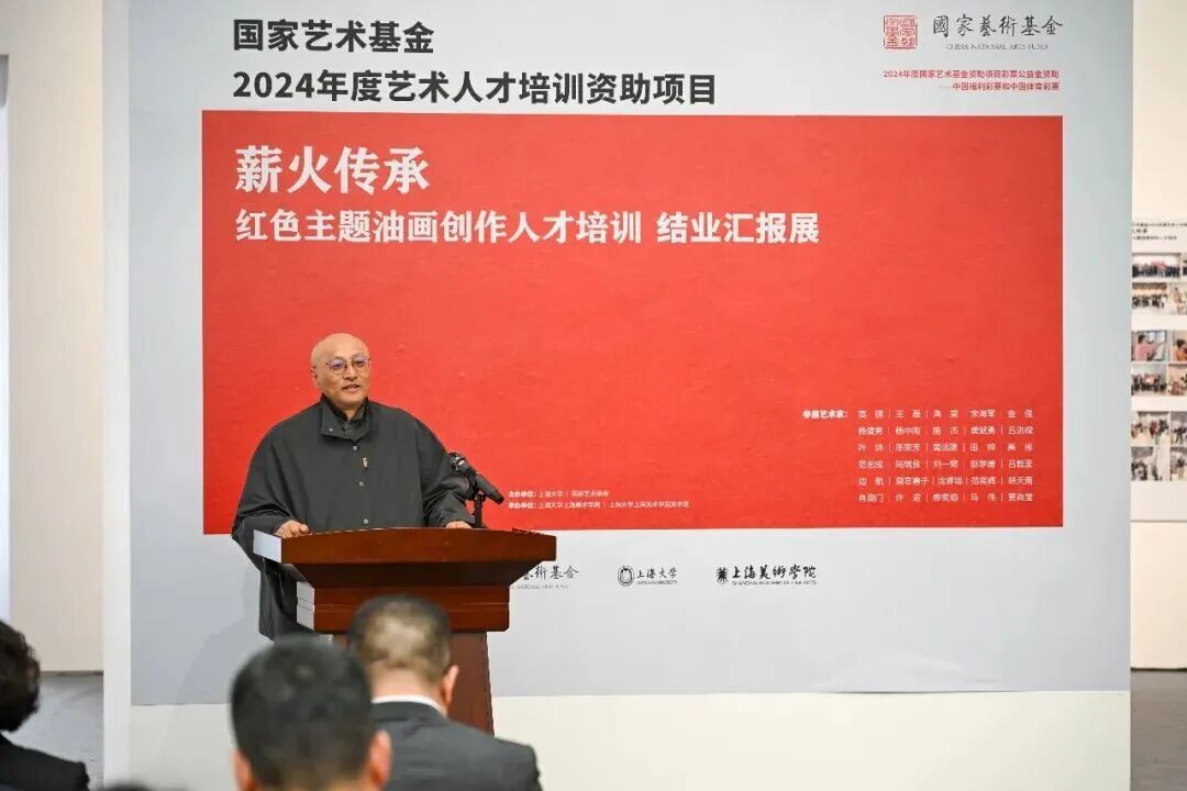 导师代表、上海油画雕塑院原院长、上海美术学院原院长、上海市美术家协会原副主席邱瑞敏致辞并宣布展览开幕。他寄语青年艺术家坚定前行、勇担时代责任,将艺术追求融入文化传承与民族复兴的宏大目标,以画笔传承红色血脉,用心创作彰显时代精神的丹青佳作。