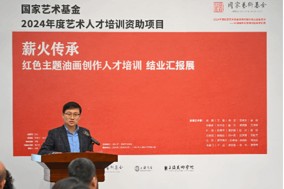学员代表,山东艺术学院油画系教师高鹏代表全体学员向国家艺术基金、上海大学及各位导师致以诚挚感谢。他回顾 182 天培训时光,学员们在课程学习、专家指导与红色寻访中精进技艺、升华思想,结下深厚情谊。他表示,结业是创作新起点,全体学员将坚守艺术初心,深耕红色题材,以优秀作品传承红色基因、助力文艺事业繁荣发展。