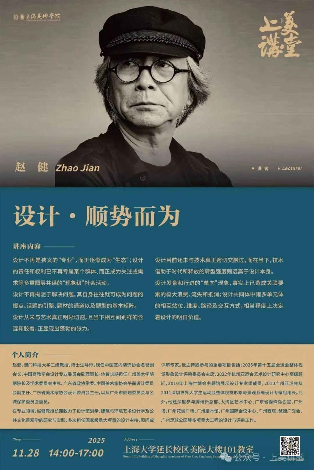 在专业领域,赵健教授长期致力于设计策划学、建筑与环境艺术设计学及公共文化景观学的研究与实践,多次担任国家级重大项目的设计主持、顾问或评审专家。他主持或参与的重要项目包括:2025年第十五届全运会整体视觉形象设计评审委员会主席,2022年杭州亚运会艺术设计研究中心高级顾问,2010年上海世博会主题馆展示设计专家组成员,2010广州亚运会及2011深圳世界大学生运动会整体视觉形象与景观系统设计专家组组长。此外,他还深度参与腾讯新总部、大湾区艺术中心、广东省委珠岛会堂、广州塔、广州花城广场、广州版本馆、广州国际会议中心、广州西塔、琶洲广交会、广州足球公园等多项重大工程的设计与评审工作。