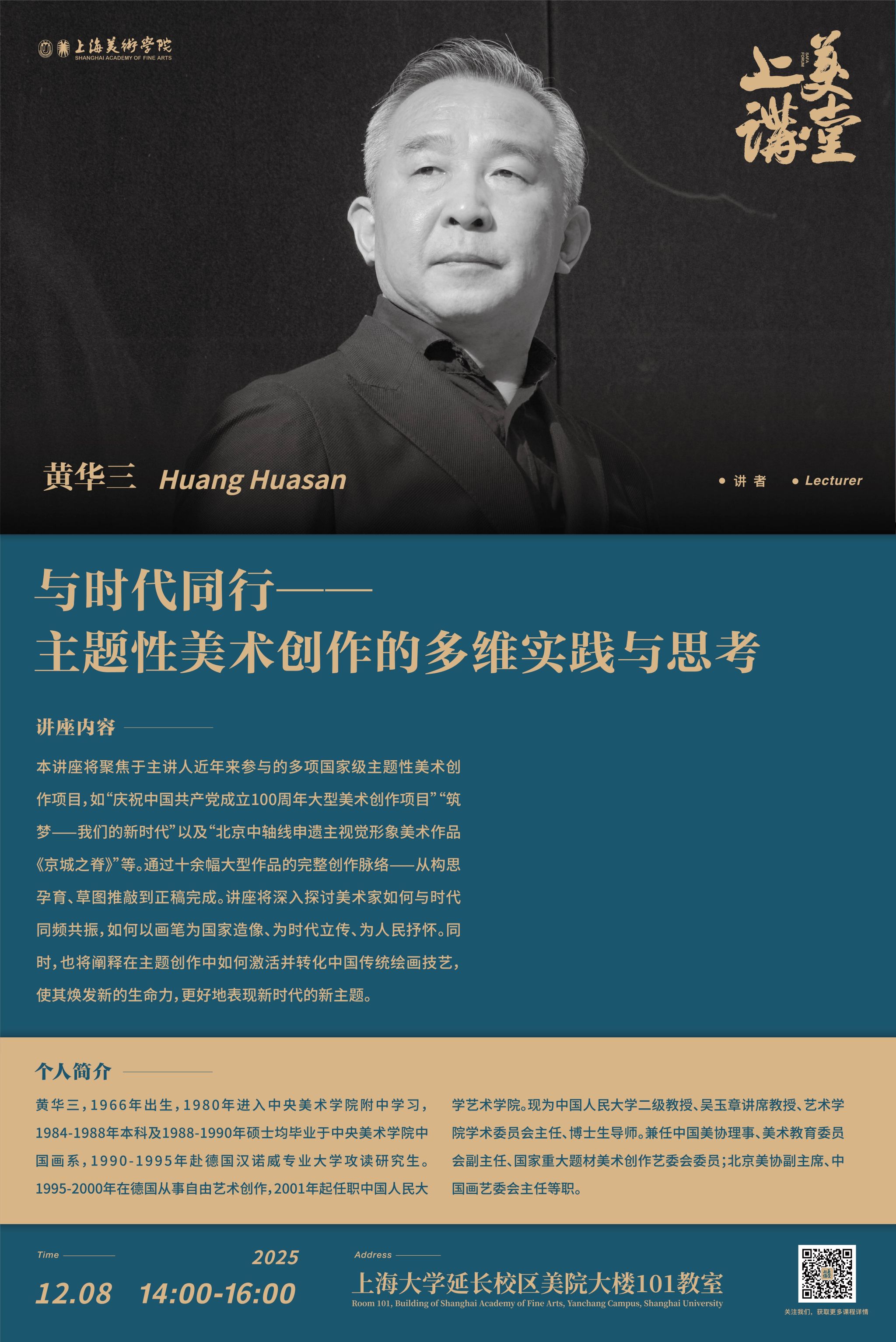 本讲座将聚焦于主讲人近年来参与的多项国家级主题性美术创作项目,如“庆祝中国共产党成立100周年大型美术创作项目”“筑梦——我们的新时代”以及“北京中轴线申遗主视觉形象美术作品《京城之脊》”等。通过十余幅大型作品的完整创作脉络——从构思孕育、草图推敲到正稿完成。讲座将深入探讨美术家如何与时代同频共振,如何以画笔为国家造像、为时代立传、为人民抒怀。同时,也将阐释在主题创作中如何激活并转化中国传统绘画技艺,使其焕发新的生命力,更好地表现新时代的新主题。
