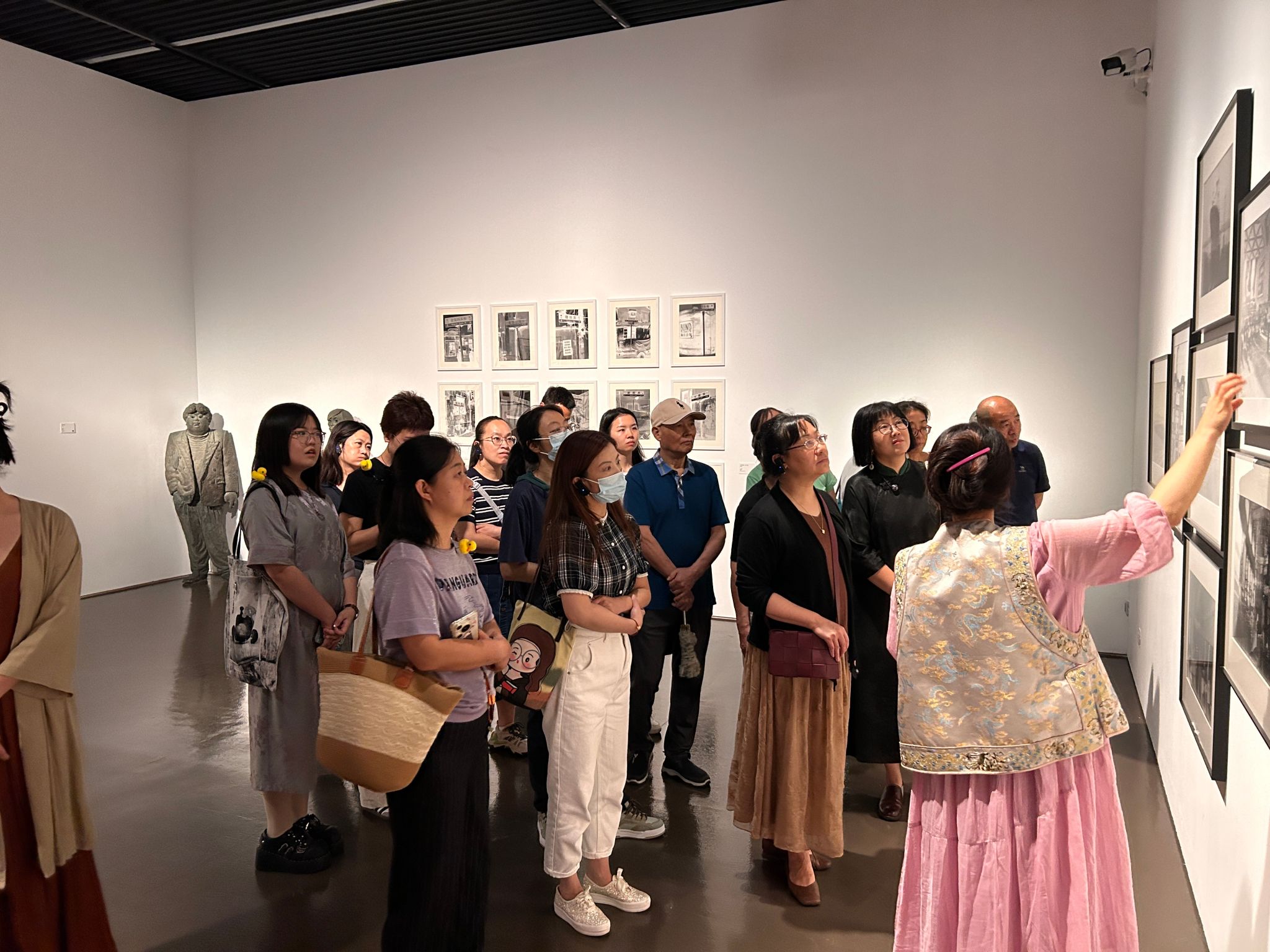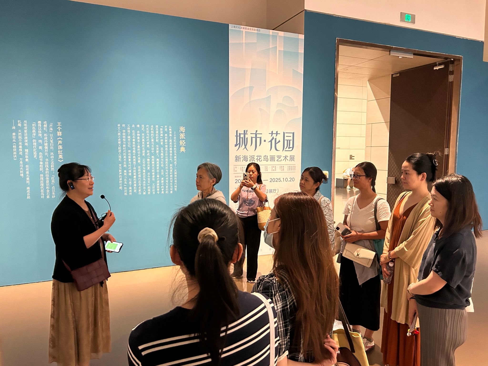 本次研学活动重点观摩了中华艺术宫内同期呈现的多项重磅展览:“万象本色——‘中国白·德化瓷’艺术大展”、“巍巍者华——中国油画学会三十年艺术展”、“城市花园”等,学院副院长毛东华、骨干教师胡建君等担任了展览讲解。在观展过程中,教师们不仅细致品味了不同艺术门类作品的独特魅力,也就艺术创作的观念、技法、材料创新以及如何将前沿艺术动态融入教学实践等内容进行思考与交流。