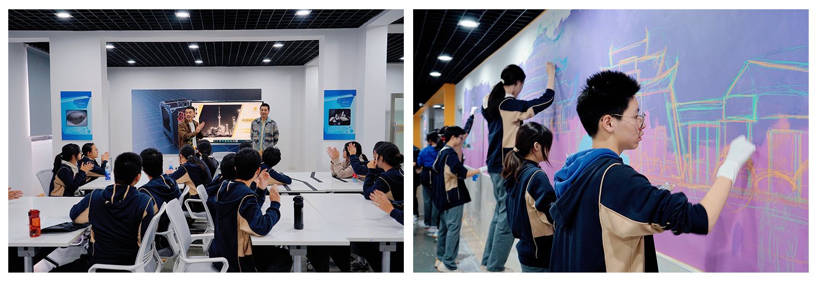 在学生实践会场,气氛同样热烈。国画系主任贺戈箫老师亲临指导,讲授了如何运用专业的构图技巧来提升墙绘作品的整体美感与表现力,引导学生们分组讨论,明确各组的科创主题与创作思路。他将深厚的艺术造诣与创新的科创主题相结合,激发学生的创作灵感,使学生在实践中深刻体会到艺术与科技融合的魅力。