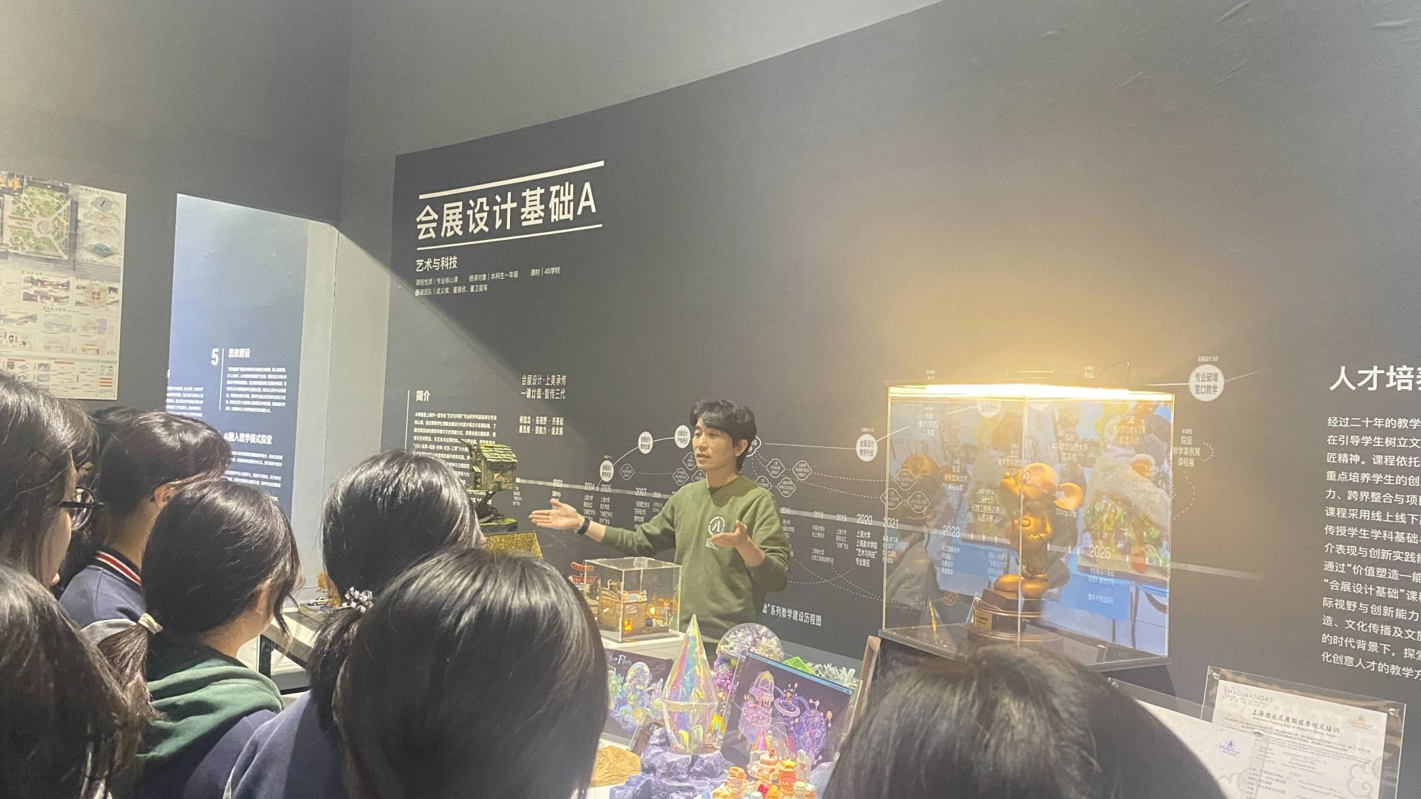 上海美术学院副院长程雪松、实验中心副主任陈光辉等接待了松江区第四中学郭洁校长、吕翔副校长等一行师生团队。松江四中的师生们首先参观了正在热展的“2025上海美术学院本科课程案例展”。展厅内,一幅幅构思精巧的画作、一件件充满创意的设计模型,生动展现了美院扎实的教学成果与前沿的创新理念。成义祺老师为松江第四中学的同学们讲解了精品课程案例《会展设计基础A》,他不仅展示了课程丰厚的教学积累,更以多个鲜活的学生案例,展现了从灵感到成品的完整创作逻辑,让同学们对大学的设计课程有了具象而深刻的理解。