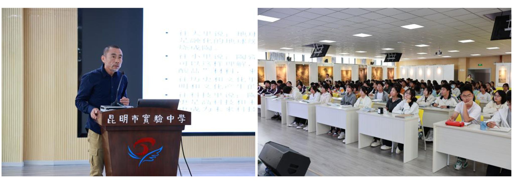与此同时,上海美术学院实验中心副主任陈光辉教授面向昆明市实验中学的学生开展了一场主题为“陶瓷艺术”的讲座,陈光辉教授以艺术史为脉络,融合陶瓷工艺技术与现代创作理念,通过古今中外经典案例与自身创作实践,生动诠释了陶瓷艺术在材料运用、形态塑造与文化表达上的多元可能。从泥土的可塑性到火焰的偶然性,深入浅出的讲解引发了在场师生的强烈共鸣,学生们在互动环节踊跃提问,现场氛围热烈。