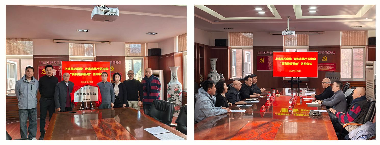 在辽宁省,上海大学上海美术学院党委副书记、纪委书记宋国栓,设计系副主任汪宁,国画系教师佟平原赴大连市第十五中学、鲁迅美术学院附属中等美术学校进行签约挂牌会议。大连市第十五中学校长佟世军,党总支书记刘秀娟,副校长金光太、刘嘉轶,美术部主任张鑫峰热情接待了上海美术学院一行。双方围绕中学与高校美育衔接、人才培养模式创新等议题进行了深入探讨。会议聚焦于探索资源共享的新模式与协同育人的优化路径,旨在建立长期、稳定、常态化的交流互访机制与教学教研合作平台,共同探索拔尖创新艺术人才的培养路径。