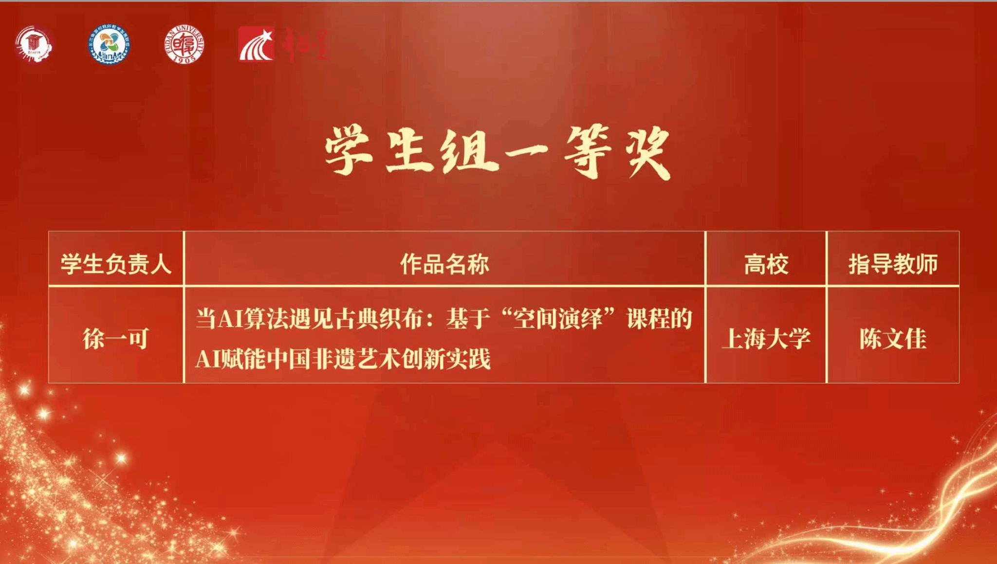 近期,长三角高校教师教学发展联盟主办的以“智启教与学,慧创新未来”为主题的首届长三角高校“超星杯:智慧教与学大赛”圆满落幕。上海大学上海美术学院学生徐一可团队的参赛作品《当AI算法遇见古典织布:基于〈空间演绎〉课程的AI赋能中国非遗艺术创新实践》荣获学生组一等奖。本次大赛吸引了43所高校参加,其中共有49个教学团队和来自23所高校的35个学生团队报名参加,徐一可团队获得了学生组唯一一个一等奖的佳绩。