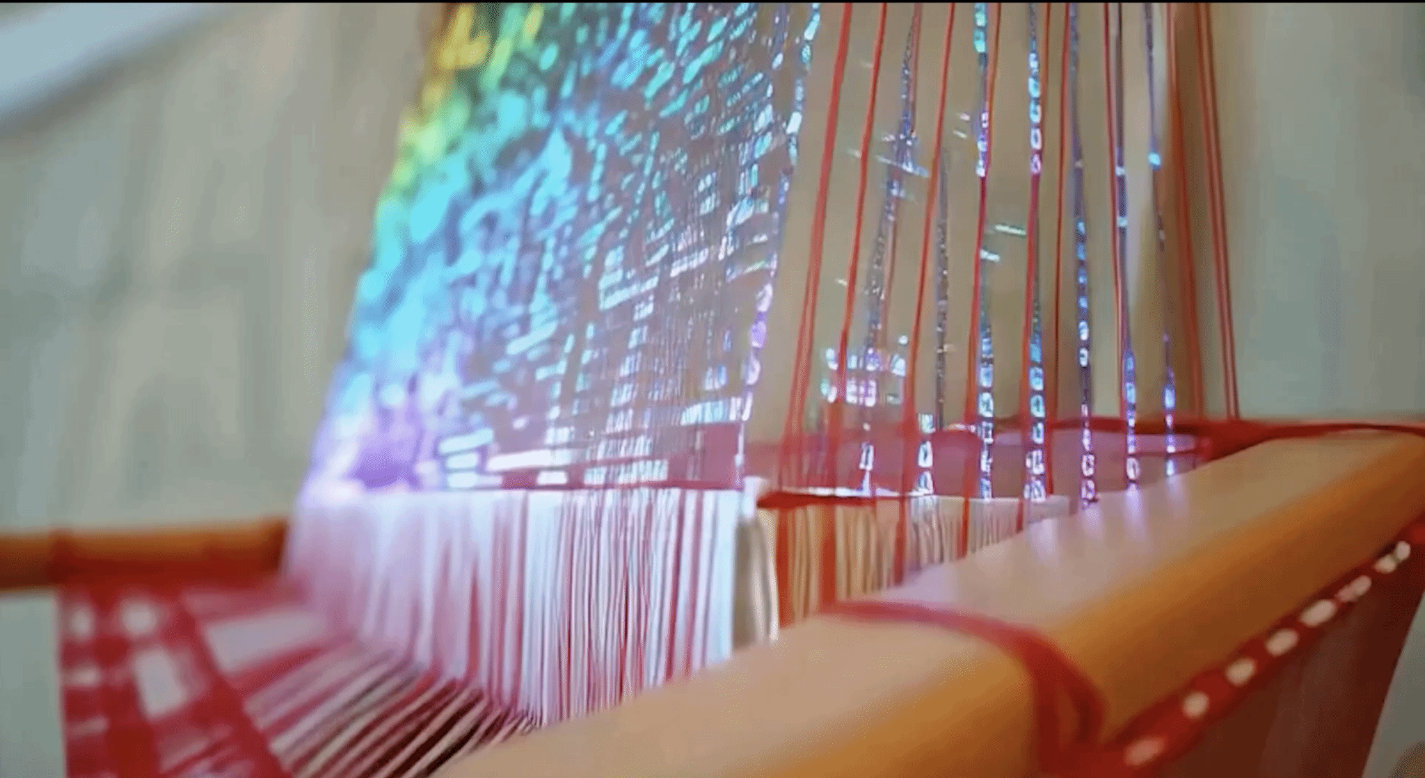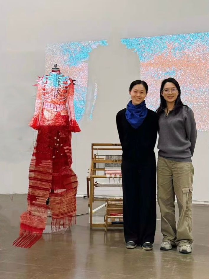 《当AI算法遇见古典织布:基于〈空间演绎〉课程的AI赋能中国非遗艺术创新实践》作品是基于上海美术学院数字媒体艺术专业课程——《空间演绎》课程中的创作练习和挑战性项目中衍生而来。学生团队负责人徐一可在学院数码系陈文佳老师的精心指导下, 以中国非遗土布纺织的经纬节奏和中国唐代五言绝句的诗词韵律为灵感,将纺织纹样和AI生成技术结合,使传统的纺织纹样呈现为数字化的动态影像,并在空间中以沉浸式的方式呈现。作品入选2025年上海设计之都大会和第十三届上海美术大展数字艺术展区。同时,后续衍生作品获得了与中国航天工程合作的机会,将以“文化搭载物”的形式随航天飞行器进入太空,以“科技时代的文化样态” 让中国非遗在太空探索中与人类的未来叙事产生共鸣。